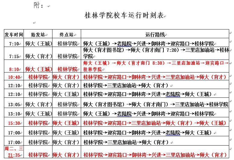 一、取消8:10(师大王城--师大育才--桂林学院)、10:40(桂林学院--师大育才)、15:30(桂林学院--师大育才--师大王城)、21:35(桂林学院--师大育才)班次,其余车次不变。具体详见桂林学院校车运行时刻表。