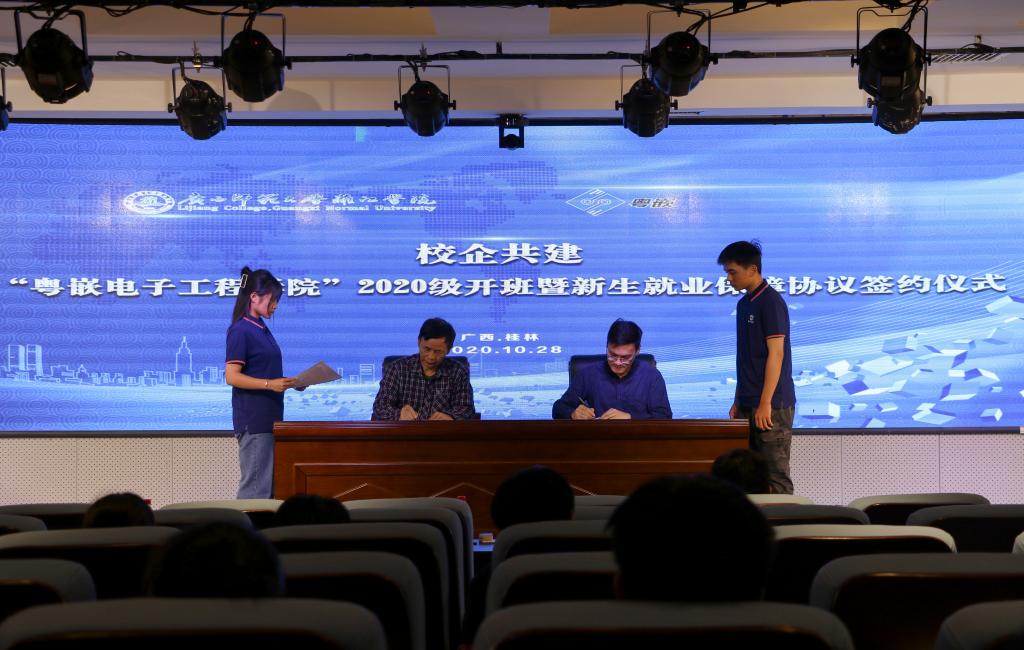 仪式上,我校党委副书记、纪委书记、副校长邓志平与粤嵌公司副总裁邓人铭共同举办了“粤嵌电子工程学院”开班仪式并签署就业保障协议。