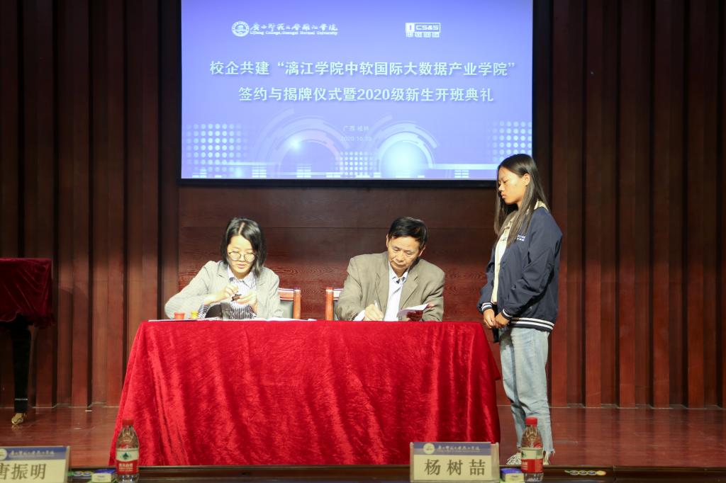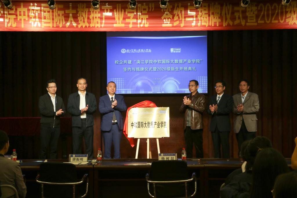 10月30日上午,我校与中软国际教育科技集团(以下简称“中软教育集团”)校企共建“漓江学院中软国际大数据产业学院”签约与揭牌仪式暨2020级新生开班典礼在学校小音乐厅举行。中软国际执行董事、高级副总裁、中软教育集团董事长唐振明、中软教育集团信创业务总经理关海涛、中软教育集团华南区总经理张航,桂林经济技术发开区党工委委员、管委会副主任黄锦堂,学校董事、校长杨树喆,校党委副书记、纪委书记、副校长邓志平,以及中软教育集团各区域经理、我校相关职能部门负责人、理工学院领导班子、教师代表和2020级数据科学与大数据专业全体新生出席签约仪式。仪式由校党委副书记、纪委书记、副校长邓志平主持。