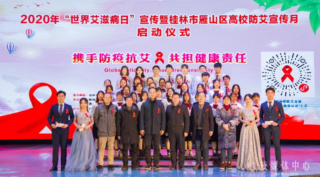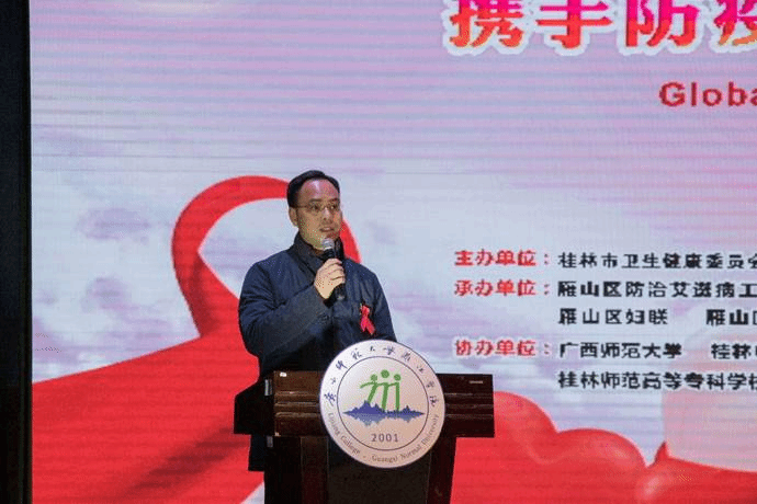 12月17日,2020年“世界艾滋病日”宣传暨桂林市雁山区高校防艾宣传月启动仪式在我校弘善讲堂举行。雁山区政府党组成员、市管二级调研员方年喜、桂林市卫生健康委员会调研员唐剑林、雁山区卫健局局长黄先明、雁山区卫健局副局长李记乔、桂林市防艾办科长周芸、雁山区政协书画院主席蓝凡武、桂林市部分高校师生代表,雁山、大埠、柘木、草坪、良丰乡镇街道办和卫生院代表,我校党委副书记、纪委书记、副校长邓志平、学生事务部相关负责人及各二级学院学生代表参加了本次启动仪式。本次启动仪式由桂林市卫健委、雁山区人民政府、广西师范大学漓江学院联合主办。