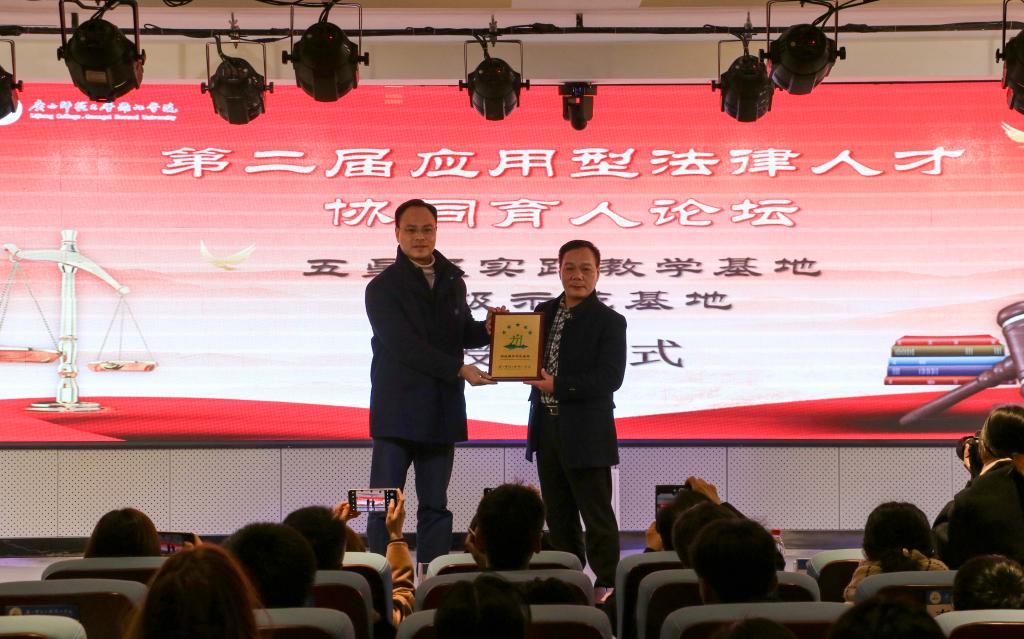 随后进行了漓江学院五星级实践教学基地和校级示范基地牌匾授予仪式。邓志平代表学校为广西通诚律师事务所颁发了“广西师范大学漓江学院五星级实践教学基地和校级示范基地”牌匾。