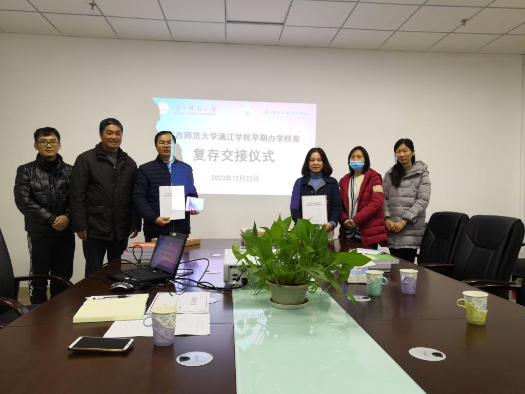 12月22日下午,我校档案馆与广西师范大学档案馆举行漓江学院早期办学档案复存交接仪式,我校总会计师、副校长祝芸芸,广西师范大学档案馆馆长刘朝文出席仪式,我校档案馆及广西师范大学档案馆相关人员参加仪式。