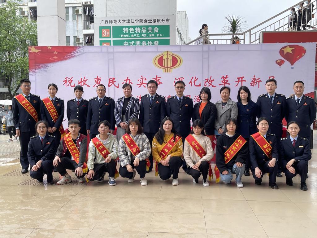 为普及税务知识,提升大学生税收法制意识,4月20日,我校以第23个税收宣传月为契机,与桂林市雁山区税务局联合开展了主题为“税收惠民办实事、深化改革开新局”税法宣传进校园活动。本次活动由雁山区税务局,我校合作发展处、法律志愿者协会、桂林市法律志愿者协会漓院分会共同承办。