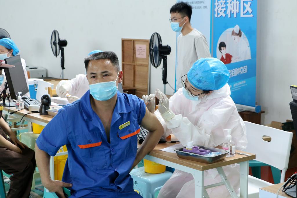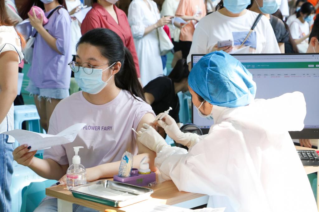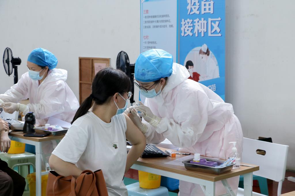 图:在“接种区”,医务人员为师生员工验证疫苗信息、接种疫苗,并告知接种后注意事项