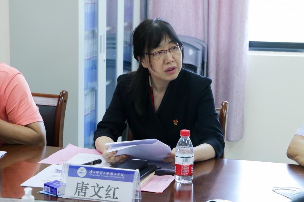 图:调研座谈会上,唐文红汇报了我校党史学习教育阶段性进展情况