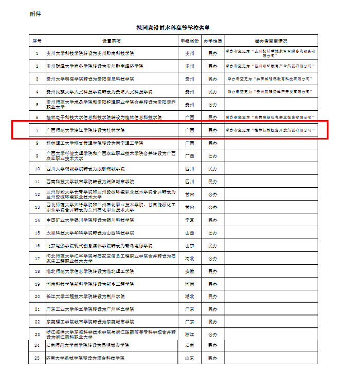 根据教育部网站消息,5月17日,教育部发展规划司发布《关于拟同意设置本科高等学校的公示》,公示中拟同意我校转设为桂林学院。