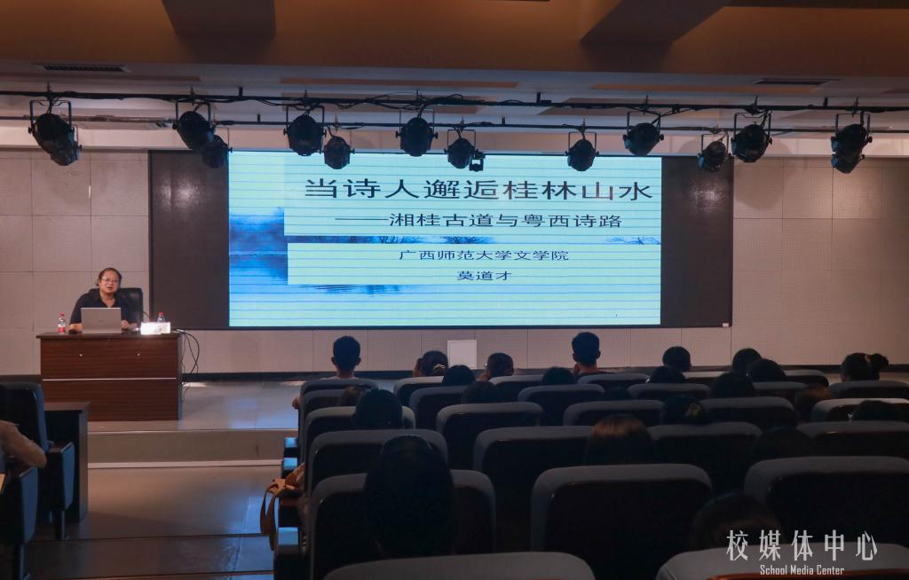 讲座伊始,莫教授以“桂林山水”为切入点,从美学的角度向同学们展示了桂林山水景色的魅力。随后详细阐述了湘桂古道的发展渊源、方向及其产生的影响,还介绍了桂林山水作为文学审美对象和文学意象在古代是如何逐渐进入诗人视野的历史过程。同时通过梳理桂林山水诗歌与山水文学从想象到体验的形成过程,引用精彩的历史典故分析唐宋时期迁谪诗人及一些文人在湘桂古道行旅之中积淀形成的粤西诗歌之路,解析了其中伤感而凄美的故事,这让我校师生从时间、空间、心灵三个角度感受到我国古典诗歌的博大精深。