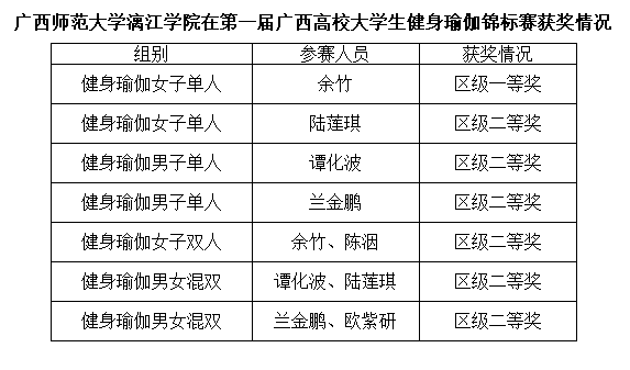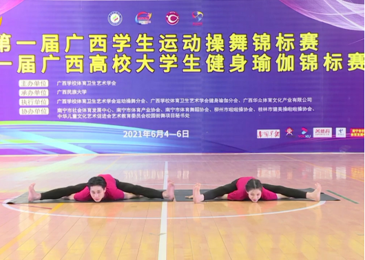 6月5日-6日,由广西学校体育卫生艺术学会主办、广西民族大学承办的“第一届广西学生运动操舞锦标赛暨第一届广西高校大学生健身瑜伽锦标赛”在广西民族大学思源湖校区隆重举行,我校健身瑜伽代表队参加了本次比赛并取得佳绩。