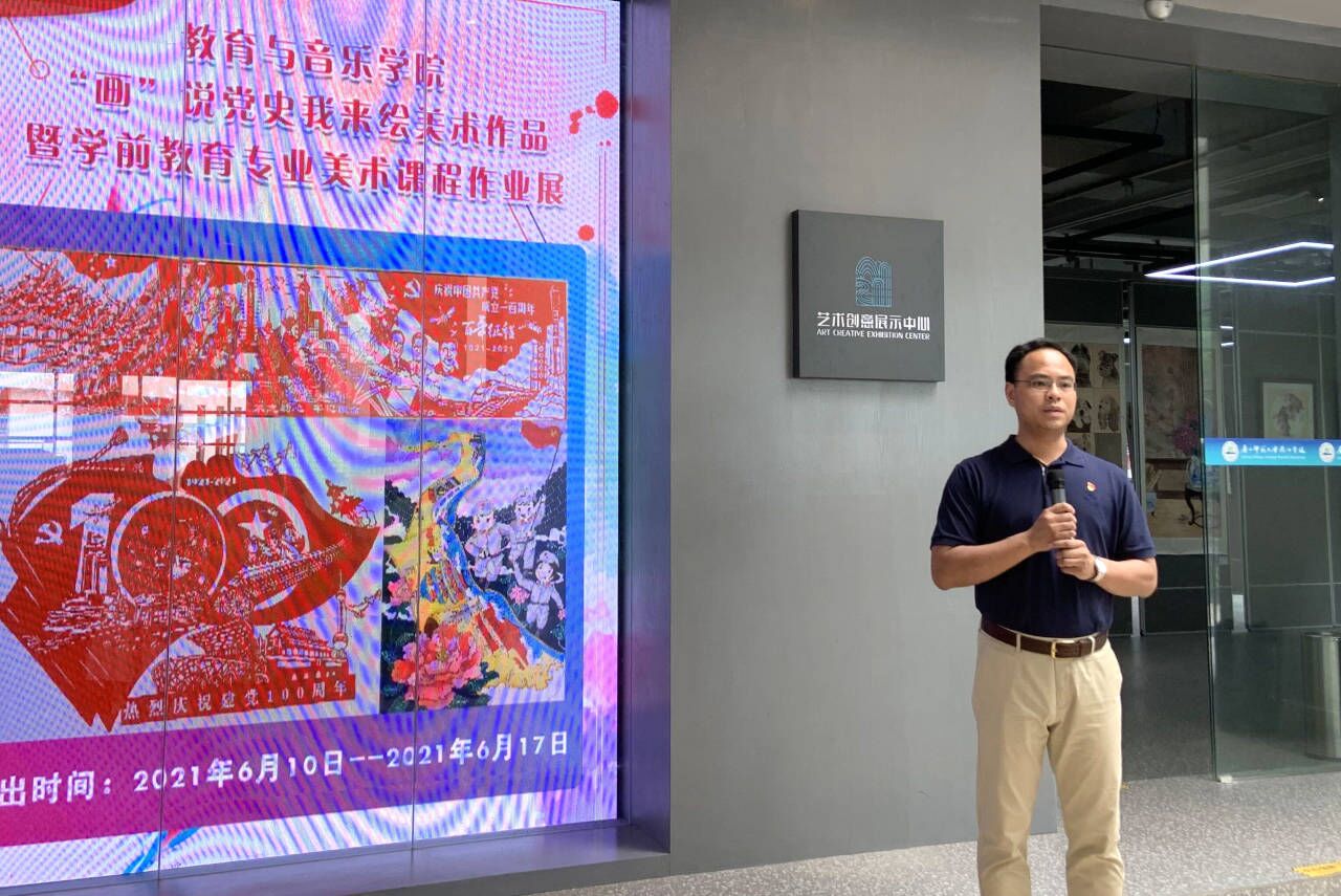 邓志平在致辞中指出,在建党100周年之际,全校师生用不同的方式学习党史,庆祝党的生日,教育与音乐学院的学生采用了绘画、手工这种创新的方式来学党史、感党恩,值得肯定和鼓励,希望老师和同学们能够大胆创新,能创作出更多更优秀的作品,把党史学习引向深入,以实际行动,向党的生日献礼。
