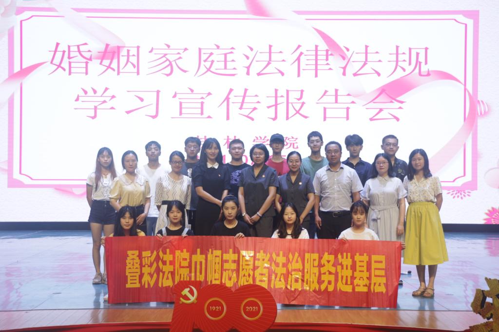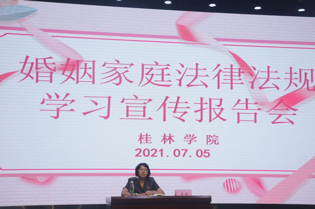 为深入学习宣传习近平法治思想,认真贯彻落实党的十九大和十九届五中全会精神,结合进一步扎实推进党史学习教育,深入开展“我为群众办实事”实践活动的需要。7月5日上午,学生事务部特邀桂林市叠彩区人民法院刘颖新、曾妤两位法官为主讲,组织学校师生代表召开婚姻家庭法律法规学习宣传报告会。学生事务部全体人员及相关二级学院副书记、辅导员参加报告会。