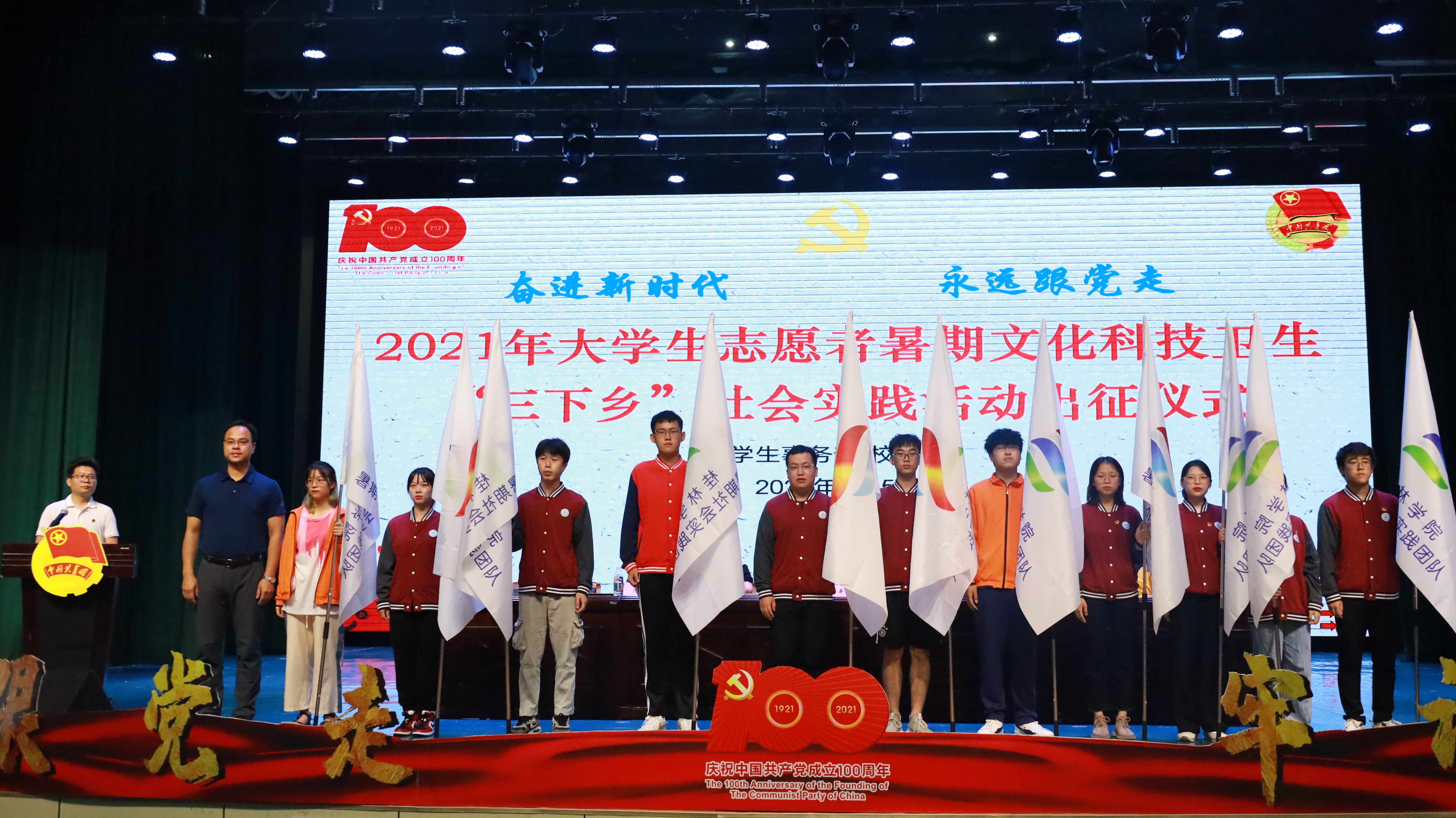 7月5日,我校2021年大学生志愿者暑假文化科技卫生“三下乡”社会实践活动出征仪式在弘善讲堂举行。校党委副书记、纪委书记、副校长邓志平出席并致辞,党政事务部、学生事务部、校团委相关负责人以及各二级学院党总支副书记、团总支书记、副书记和各二级学院学生代表参加出征仪式。