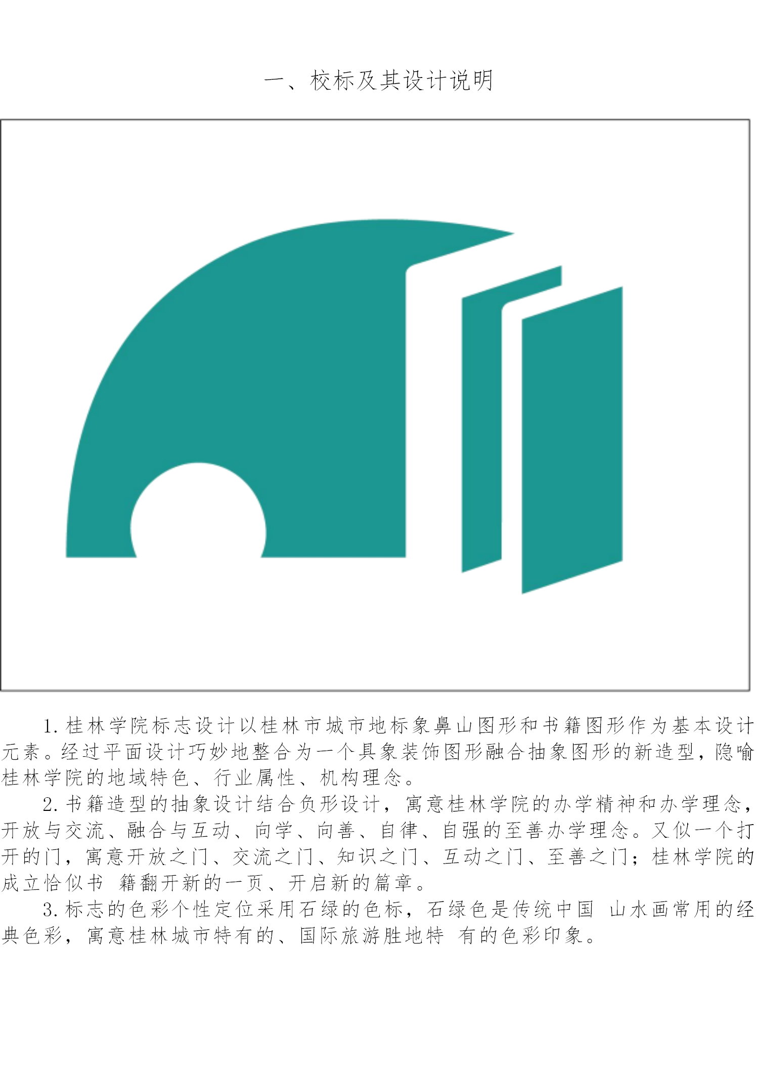 3.校标下方的水平线条似象鼻山倒影水纹,表现桂林学院地 处桂林山水名城的地域特点,隐喻上善若水的传统文化精神。