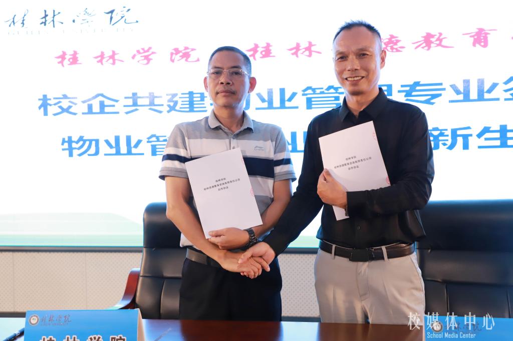 杨校长强调,走校企合作、产教融合的转型发展之路,是学校前身广西师范大学漓江学院的优良传统,更是后继者桂林学院未来发展的必然选择。截止2021年,学校先后与多家国内知名企业开展校企合作,共建了“名淘电商学院”“融媒体学院”“粤嵌电子工程学院”“东软软件学院”“中软国际大数据产业学院”等产(行)业学院,为培养适应区域经济社会发展所需要的应用型、技术技能型人才奠定了一定的基础。物业管理专业是我校去年向教育部备案、今年首次面向全国招生的专业,也是目前广西高校中唯一开设的本科专业。今天,我们与桂林崇德教育咨询有限责任公司签订共建物业管理专业协议,标志着我校的转型发展又迈上了新的台阶。希望校企双方进一步加强交流与沟通,本着“互相学习、优势互补、资源共享、合作共赢、共谋发展”的原则,共同打造校企合作、产教融合的新典范。