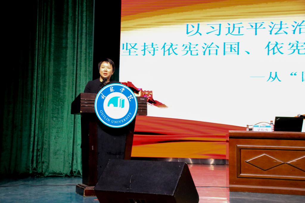 12月6日下午,我校在弘善讲堂举行学习贯彻党的十九届六中全会精神暨宪法宣传教育报告会。桂林市人民检察院党组书记、检察长梁贻勇,桂林市雁山区人民检察院检察长潘险峰,校领导杨树喆、邓志平、杨庆庆以及师生代表共500余人参加报告会。报告会由杨庆庆副校长主持。