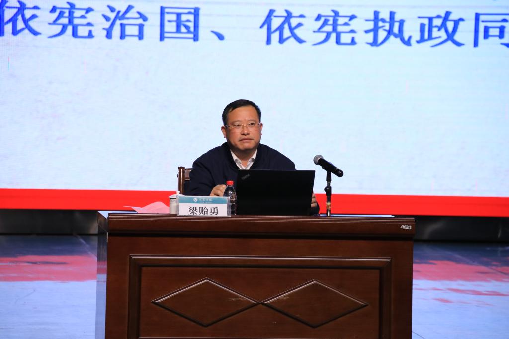 随后,梁贻勇检察长为我校师生作题为《以习近平法治思想为引领坚持依宪治国、依宪执政 推进全面依法治国》的报告。他从“国家宪法日”的由来、深刻领会习近平法治思想的深刻内涵、宪法、法律的基本知识、我国宪法的历史、现行宪法的具体内容等方面展开,报告内容丰富,既有学理的高度和深度,让师生更好地把握习近平法治思想的深刻内涵和“国家宪法日”的相关知识,也有真实的案例分析,让大家近距离的感受到了一线法治工作者的精彩,是一次生动又深刻的法治教育实践教学活动。报告最后,梁检察长提出“弘扬宪法精神,树立宪法思维,推动依宪治国、依宪执政”的倡议,我们既要全面把握宪法核心要义和精神实质、做好宪法学习宣传;要遵守宪法,维护宪法权威,深入推荐宪法贯彻实施;更要以习近平法治思想为引领,扎实践行宪法,推进依宪行政、依法履职,推动全面依法治国进程。
