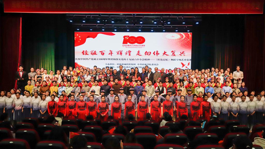 12月20日晚,为了庆祝中国共产党成立100周年,深入贯彻落实党的十九届六中全会精神,我校与桂林新城投资开发集团有限公司共同举办以“致敬百年辉煌 走向伟大复兴——庆祝建党100周年、贯彻落实党的十九届六中全会精神”为主题的《红色记忆》舞蹈专场主题艺术党课。