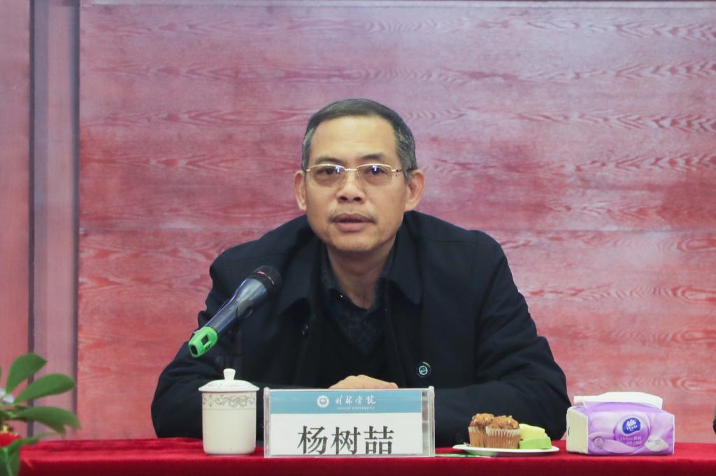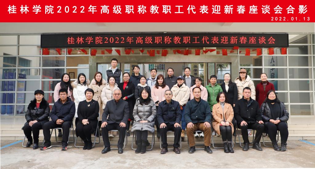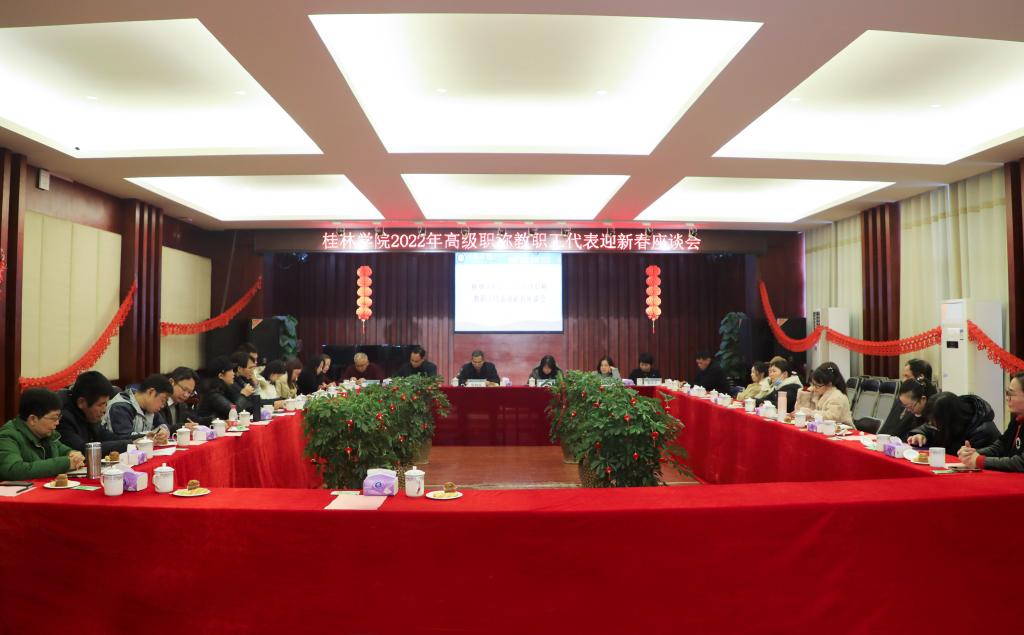 校长杨树喆在致辞中首先代表校行政校党委,向一年来辛勤工作在教学、科研、管理、服务一线的全校自有教职工,支持学校发展的退休老同志和广大外聘兼职教师,致以诚挚的问候和衷心的感谢。接着,他从十件大事回顾了学校2021年从广西师范大学漓江学院转设为桂林学院前后各项工作取得的成果,并表示学校将认真研究吸纳各位高级职称教职工代表的意见建议,更好地改进工作、促进发展。
