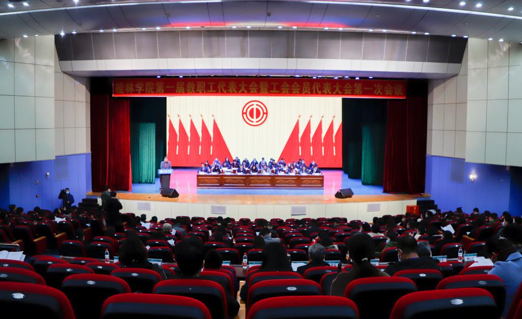 1月15日上午,桂林学院第一届教职工代表大会暨工会会员代表大会第一次会议在弘善讲堂隆重召开。校领导杨树喆、唐文红、邓志平、祝芸芸、刘文革、杨庆庆以及大会主席团成员在主席台就座。市总工会党组成员、副主席、教育工会主席莫曦媛,市教育工会常务副主席陈东,校董事会领导周道林、郑善华莅临指导。正式代表、特邀代表、列席代表近150人参加大会。