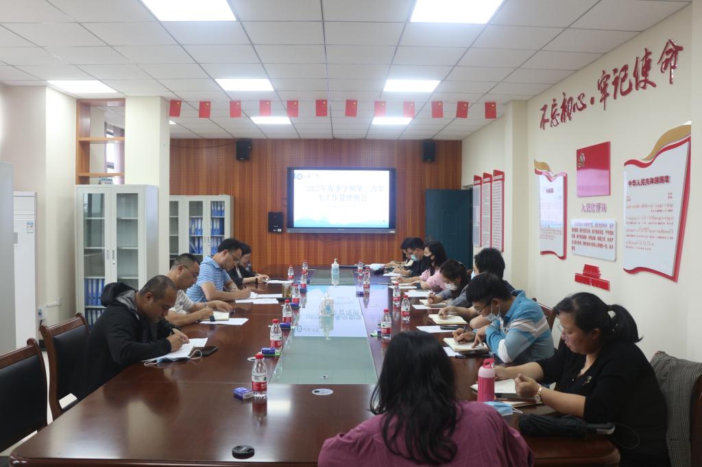 5月12日下午,我校在知善楼8312会议室召开2022年春季学期第二次学生管理工作例会。校纪委负责人、副校长邓志平,学生事务部班子及相关人员,各二级学院分管学生工作副书记参加会议。