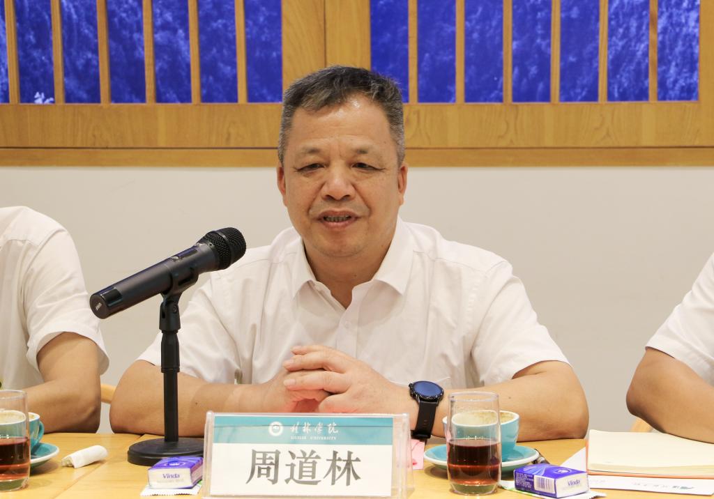 座谈会由桂林学院董事长周道林主持。他首先代表学校对贺祖斌校长一行的到来表示热烈欢迎,对广西师范大学长期以来特别是过去一年中给予我校的帮助与支持表示衷心感谢。周道林表示,自2021年5月31日教育部致函自治区人民政府同意广西师范大学漓江学院转设为桂林学院以来,广西师范大学积极履行《终止合作举办广西师范大学漓江学院暨善后事宜协议书》有关约定,在保留学校高层管理人员、职称自主(委托)评审、部分学生住宿与管理、外聘教师选派和教学场地使用、教职工子女入学、新冠疫情防控等方面大力支持我校发展,并将“继续支持桂林学院发展”列入广西师范大学党委行政2022年工作要点。今天,贺祖斌校长一行专程前来传经送宝,这份真情实意让全体师生深受感动。