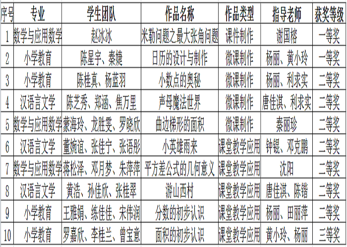 近日,由自治区教育厅主办、广西教育技术学学会和广西教师信息化应用与发展研究中心联合承办的2022年全区师范生信息化教学应用大赛在官网公布获奖情况。我校选送的10件作品分别参加资源制作类(微课)、教学应用类的评比,喜获一等奖2项,二等奖7项,三等奖1项大满贯的优异成绩,是全区民办高校中荣获一等奖及所获奖项数量最多的学校。
