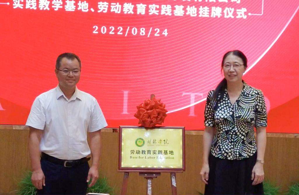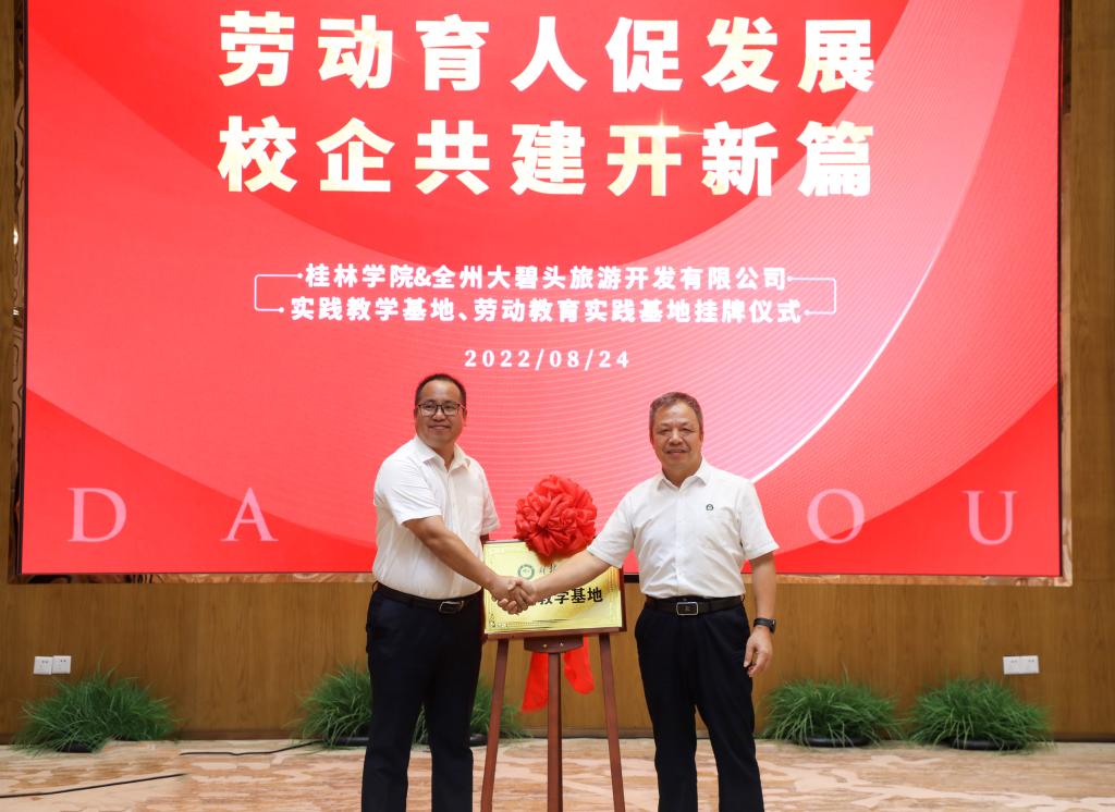 8月24日,在“桂林学院第二届(2022年)发展与改革暑期研讨会”期间,学校与全州大碧头旅游开发有限公司开展实践教学基地、劳动教育实践基地挂牌仪式。学校董事长周道林,校领导杨树喆、唐文红、邓志平、杨庆庆,以及相关职能教辅部门、二级学院负责人;全州大碧头旅游开发有限公司总经理伍先玉、副总经理宾泽艺及相关部门负责人共同参加了挂牌仪式。仪式由学校副校长、工会主席杨庆庆主持。