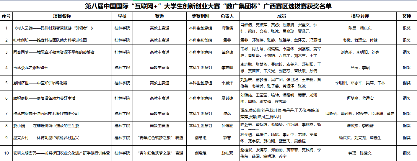 近日,自治区教育厅公布了第八届中国国际“互联网+”大学生创新创业大赛“数广集团杯”广西赛区选拔赛获奖名单,《村入云端——民俗村落智慧旅游“引领者”》《桂林创坊——雏鹰科技团队助力科学进校园》两个项目团队获得银奖,《悬网济世——中医知识ip孵化器》《星亮乡村——体育明星IP赋能乡村振兴》等8个团队获得铜奖。学校推荐参赛的10支队伍全部获奖,银奖数量较2021年增加1项。