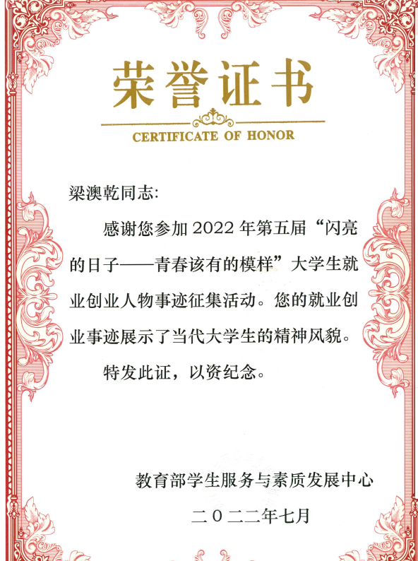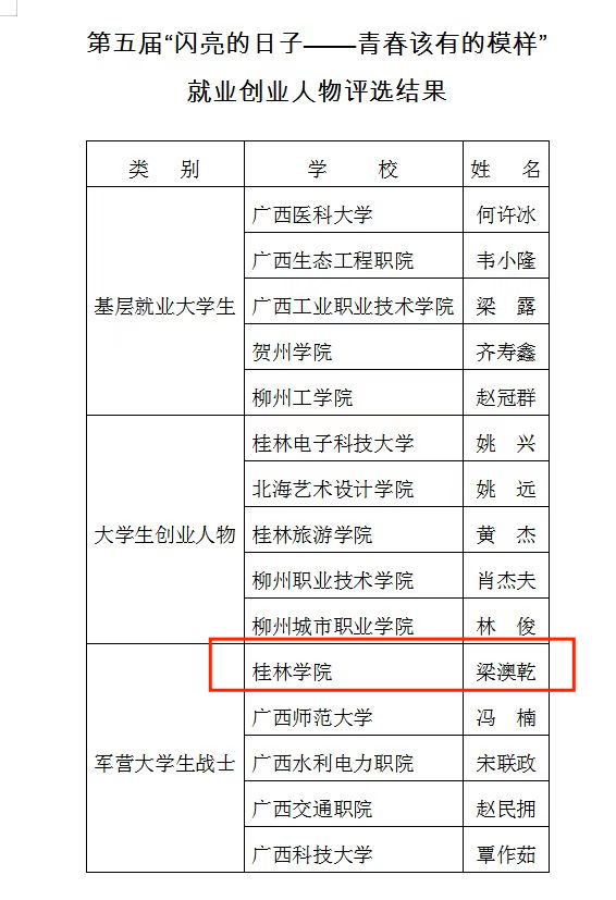 本次活动由教育部学生服务与素质发展中心举办,经过学校初选申报、广西壮族自治区教育厅复审推荐以及教育部遴选,梁澳乾在自治区大学生就业创业人物事迹中脱颖而出,自治区共有5名学生入选“军营大学生战士”人物事迹。