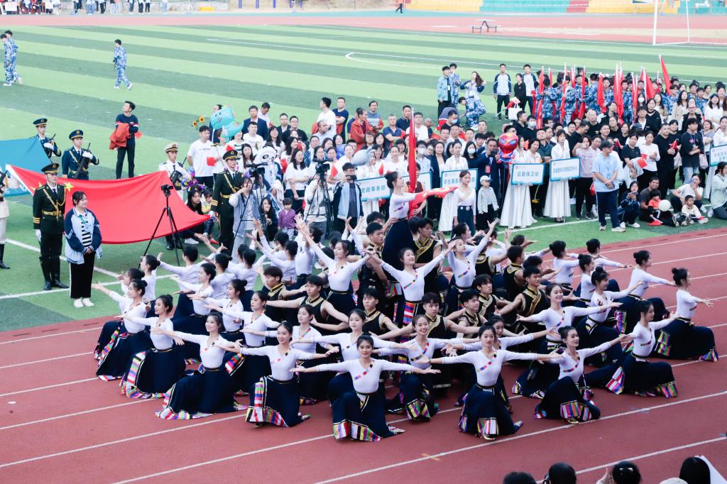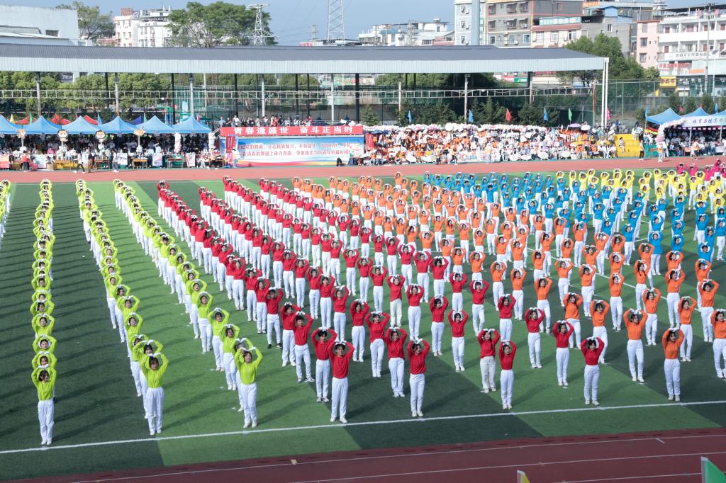 最后,来自各二级学院、身着色彩鲜艳服装的900余名学生表演的大型团体操《青春舞》点燃了全场,将现场气氛推向高潮。同学们精神饱满、动作整齐、舞姿轻快、笑容自信,处处洋溢着青春的风采,成为现场一道靓丽的风景线,展现了我校学子阳光自信、积极向上的精神风貌。