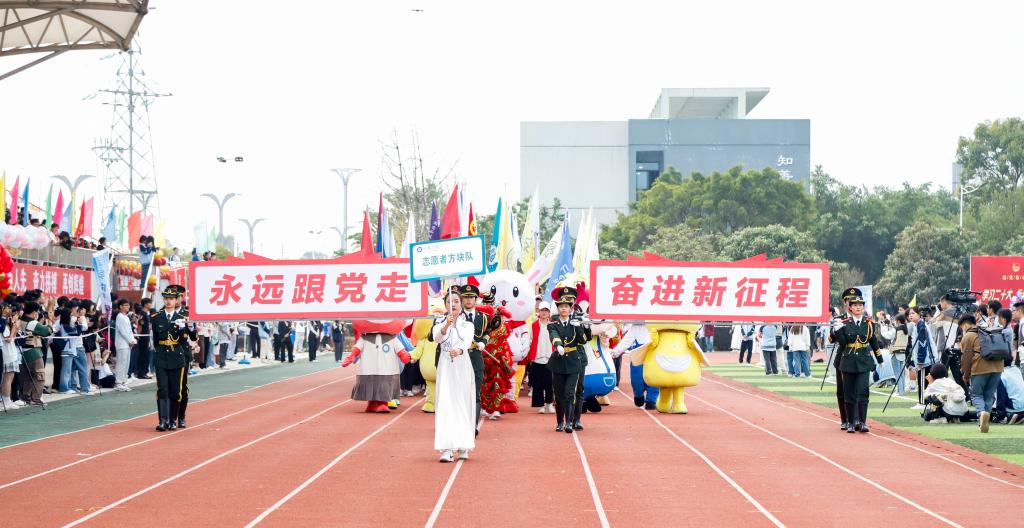 上午8点半,伴随着激昂雄壮的《运动员进行曲》,国旗护卫队、志愿者方队、裁判员方队、各参赛代表方队精神抖擞,迈着矫健的步伐依次入场。各二级学院方队围绕献礼党的二十大、谱写中国式现代化、坚定理想信念、增强文化自信等主题,精心编排,进行了独具特色和创意的方队表演,既体现了我校师生“向学、向善、自律、自强”的校训精神,又表达了爱党爱国荣校的赤子之心。