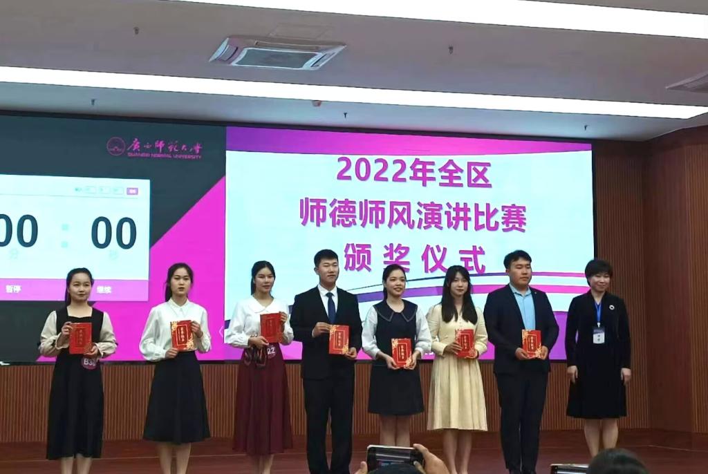3月18日至19日,由自治区教育厅主办、广西师范大学承办的2022年全区师德师风演讲比赛在广西师范大学育才校区顺利举行,我校2021级音乐学专业潘鼎同学脱颖而出喜获一等奖(第一名),我校连续两年在该项赛事中取得第一名的佳绩。