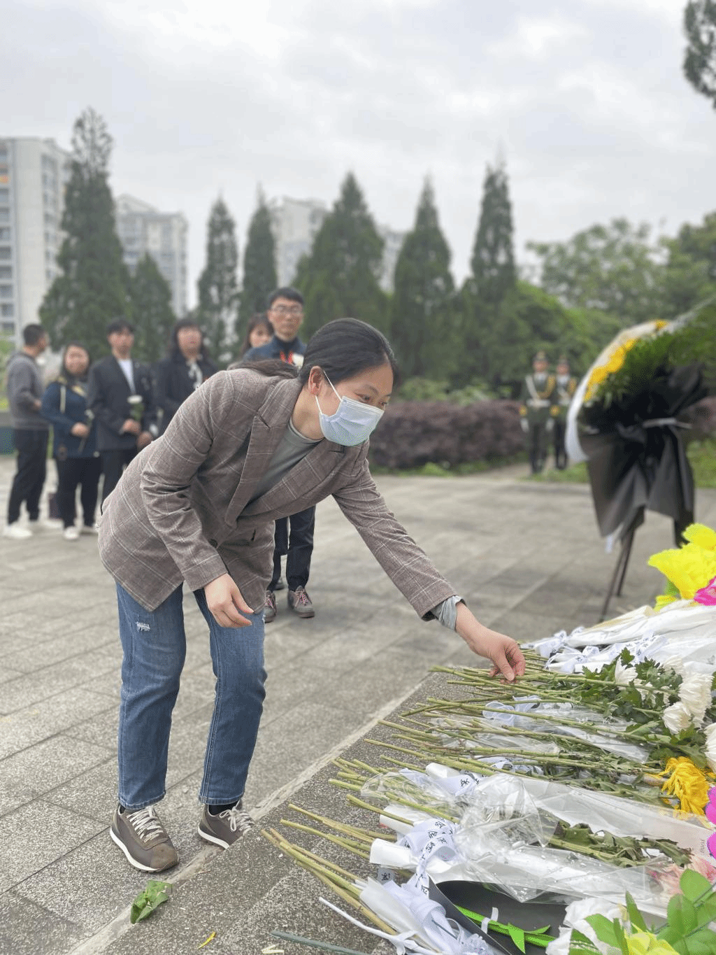 最后,师生代表依次走到墓碑前,献上手中鲜花并缓步绕行瞻仰马君武墓碑。