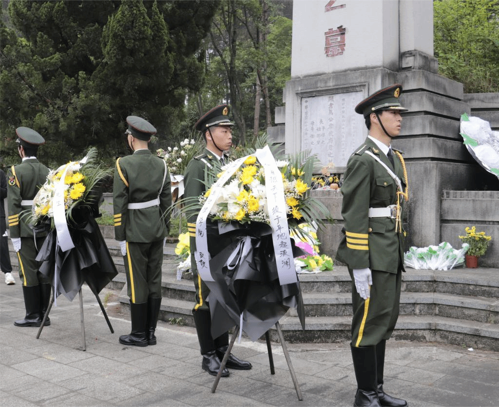 默哀毕,手持鲜花的共青团团员面向马君武墓碑献唱《光荣啊,中国共青团》。方阵前,以人文学院、金融与法律学院名义敬献的2个花篮一字排开。花篮白色缎带上书写着“深切缅怀马君武先生”的深色大字。奏响深情的《献花曲》,4名国旗队队员稳稳抬起花篮,缓步走向马君武墓碑,将花篮摆放在墓碑基座上。