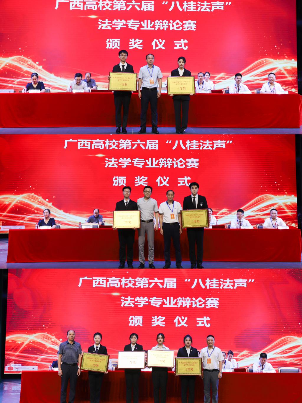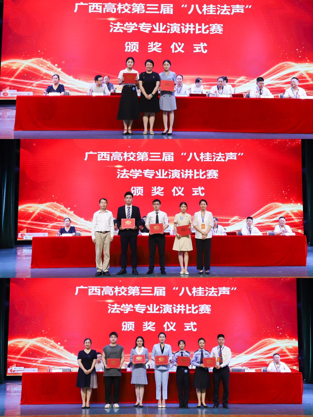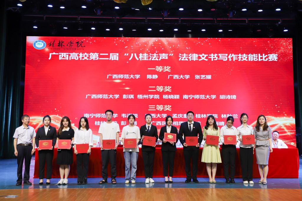 随后,广西高校第六届“八桂法声”法学专业辩论赛、广西高校第三届“八桂法声”法学专业演讲比赛同时举行。来自全区11所高校的近百名优秀法学学子英姿勃发,闪亮登场。在承办方桂林学院的精心准备下,各项赛事紧张有序地开展。辩论赛共有12支队伍参赛,演讲赛有22名选手参赛,本届法律文书写作比赛此前共有21支队伍参赛。经过半天激烈的角逐,广西民族大学辩论队、广西民族大学相思湖学院辩论队在12支队伍中脱颖而出,荣获辩论赛一等奖;梧州学院李佳同学和广西民族大学蒋彤同学力克群雄,勇夺演讲比赛一等奖桂冠;广西师范大学陈静同学和广西大学张艺耀同学表现突出,喜获法律文书写作技能比赛一等奖。出席会议的领导分别为获奖单位及选手颁奖。