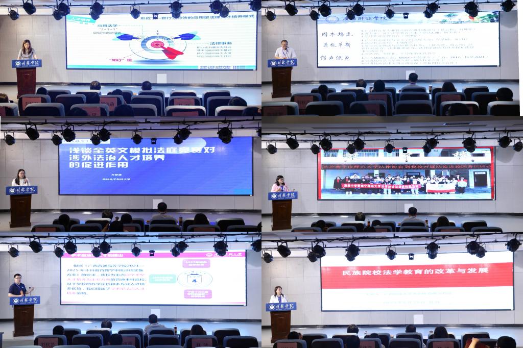 开幕式后进入在主题发言环节。广西财经大学法学院李刚博士、桂林电子科技大学法学院/知识产权学院方梦源副教授、广西民族大学法学院覃晚萍教授、南宁师范大学法学院陈西茜讲师、广西警察学院法学院廖原院长、广西师范大学法学院张融副教授、广西大学法学院魏艳茹教授、广西民族大学相思湖学院法学院梁旋副教授、玉林师范学院政法学院覃腾英副教授、梧州学院法学院骆庆国院长、桂林学院金融与法律学院林驰院长先后作主题发言,分享了所属高校在培养法学人才、打造办学特色等方面的教学经验,提出了对法学教育教学、人才培养模式的思考,让听众受益匪浅。