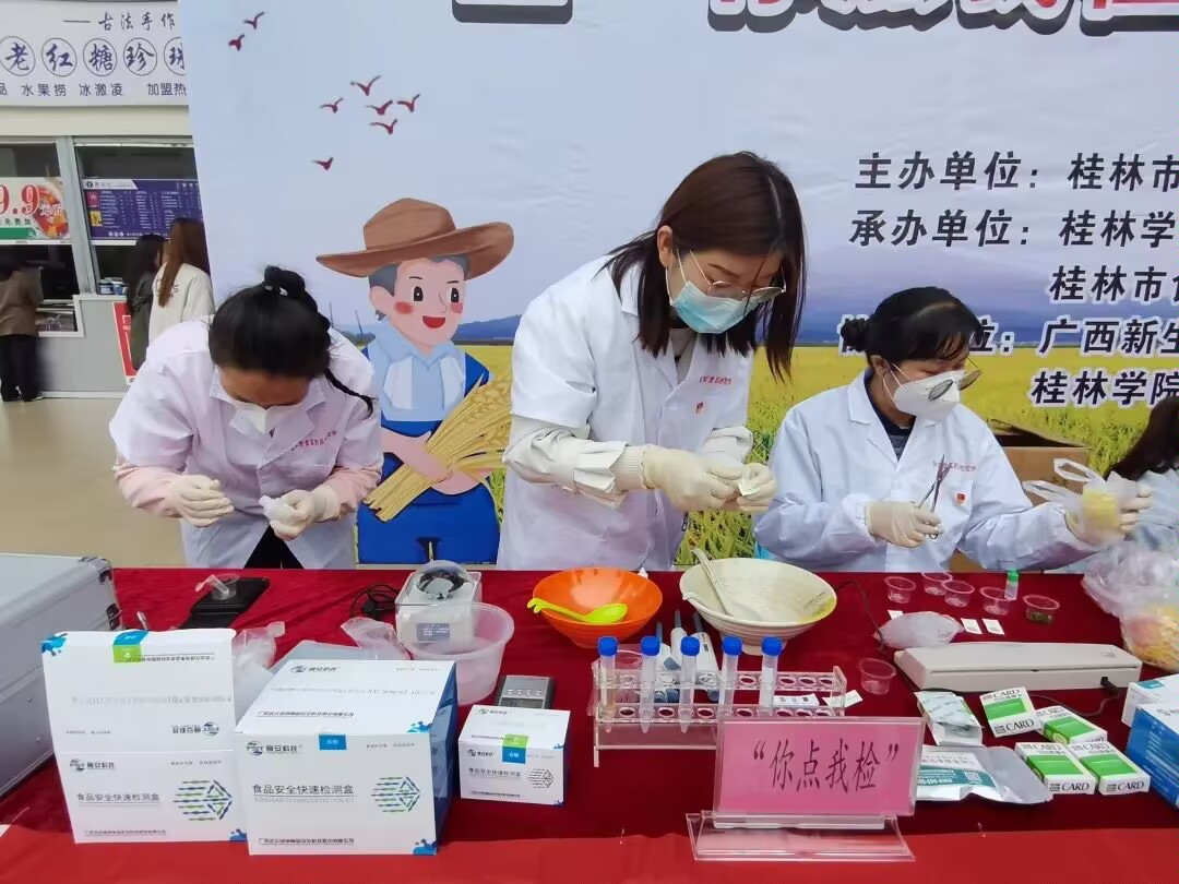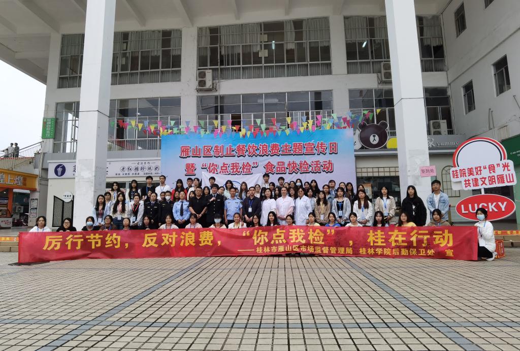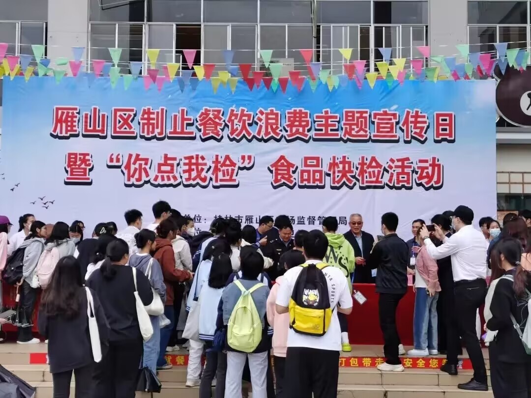 为全面贯彻落实习近平总书记对制止餐饮浪费行为作出的重要指示精神,营造厉行节约、反对浪费的社会新风尚。5月23日,学校联合桂林市雁山区市场监督管理局、桂林市食品药品检验所在乐善食府广场开展制止餐饮浪费暨“你点我检”食品快检宣传活动。桂林市雁山区市场监督管理局局长游晓军、副局长夏桂春,学校副校长刘文革、后勤保卫处相关负责人出席活动。