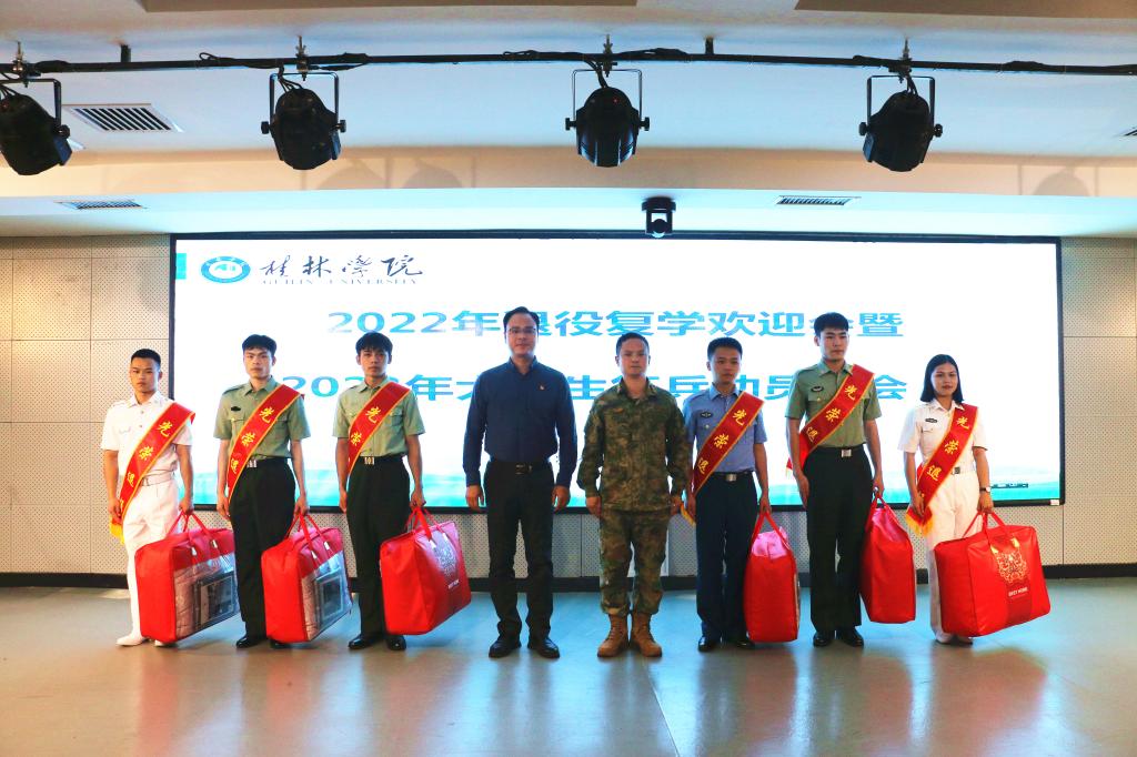 为深入学习贯彻党的二十大精神和习近平强军思想,增强我校学生的国防教育观念,5月25日下午,我校在至善讲堂召开2022年退役复学学生欢迎会暨2023年大学生征兵动员会。校党委副书记、纪委书记、副校长邓志平出席会议,学生事务处(部)主要负责人及相关人员,各二级学院分管学生工作副书记、全体辅导员、2022年退役复学学生、学生代表参加会议。会议特邀桂林市雁山区人民武装部副部长雷琳作动员宣讲。