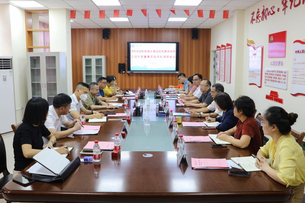 6月7日上午,桂林城乡建设控股集团有限公司(以下简称“城建集团”)总裁肖笛波、纪委书记黄江训,城建集团外部董事吴琪志、刘世杰、杨俊、易莉,城建集团办公室负责人梁艳等一行7人来校调研指导工作。学校法定代表人、城建集团党委副书记诸葛长,校领导杨树喆、邓志平、祝芸芸、杨庆庆、何玲、蒋毅,校财务总监刘拼,学校办公室负责人秦丽芸参加调研。调研座谈会由诸葛长主持。
