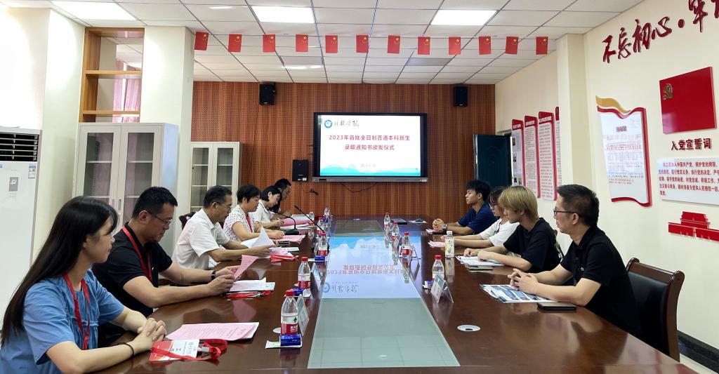 7月26日上午, 桂林学院2023年首批全日制普通本科新生录取通知书颁发仪式在知善楼8312会议室举行。校长杨树喆签发了2023年首批本科生录取通知书。我校2023年录取本科新生、家长代表,学校办公室、教务与产教融合处、发展与质量评估处、学生事务处(部)、招生办公室等相关部门负责人及工作人员参加仪式。录取通知书颁发仪式由副校长何玲主持。