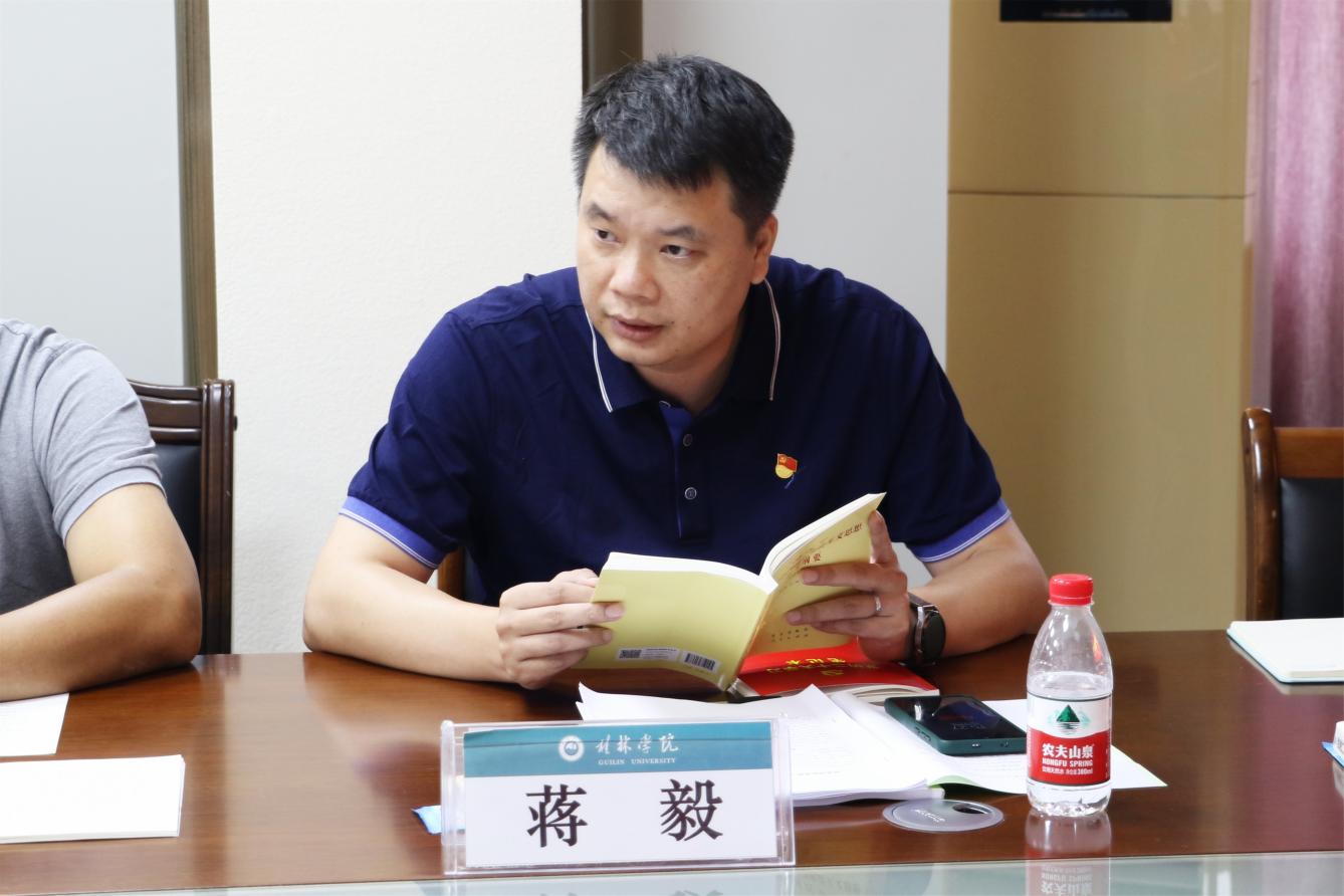 随后,校党委委员、纪委书记、校党委副书记、副校长邓志平,校党委委员、副校长、工会主席杨庆庆和校党委委员、副校长蒋毅分别围绕学习习近平新时代中国特色社会主义思想,从“学习领会习近平总书记关于全面从严治党、推进自我革命的重要论述,全面深化新时代‘清廉桂院’建设”“运用好‘两个结合’的科学方法论,推动桂林学院做大做强”“深入学习贯彻习近平法治思想,扎实推进依法治校、依法办学”等三个方面,结合工作实际畅谈心得体会。