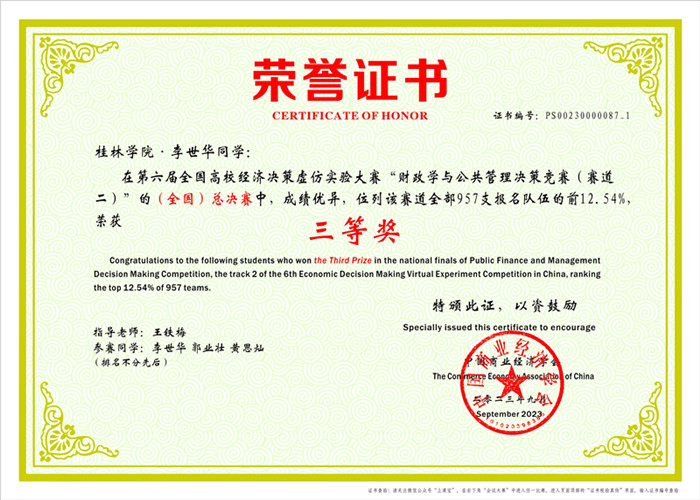 近日,全国高校经济决策虚仿实验大赛顺利落幕,金融与法律学院参赛学生在赛道二:财政学与公共管理决策竞赛中喜获佳绩。通过积分赛、区域赛层层选拔,我校参赛选手一路过关斩将进入全国总决赛,并取得二等奖1项(宋烨豪团队),三等奖2项(杨伊杰团队、李世华团队)的历史好成绩。