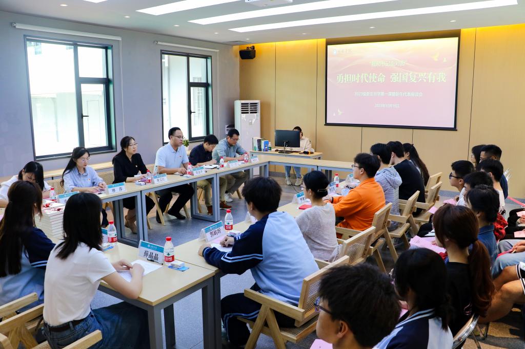 10月19日上午,我校在杉湖家苑“一站式”学生社区举行“我和书记面对面”暨新生代表座谈会。会议以“勇担时代使命,强国复兴有我”为主题,从奋斗与担当、时代与青春、强国复兴有我三个维度,向初入大学的青年学子们敞开校园、指引前路,帮助新生感悟校史底蕴,厚植家国情怀,砥砺强国志向。