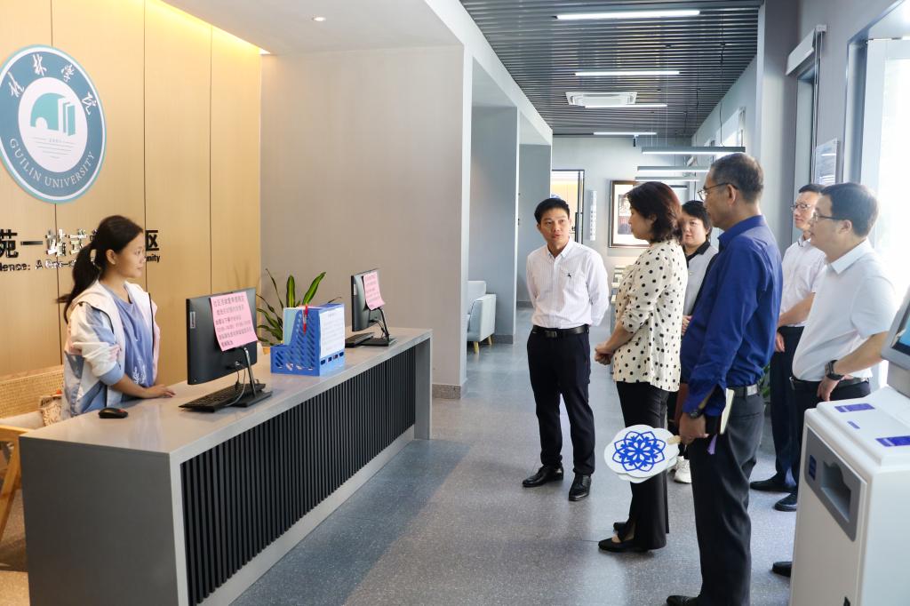 郑平一行先后实地考察了艺术创意展示中心、杉湖家苑“一站式”学生社区、大学生心理健康教育与咨询中心等功能区域。在艺术创意展示中心,郑平参观了学前教育专业学生手工和书画作品展,详细询问学生们精心设计的形式多样、立足传统、玩教合一、创意新颖的手工作品,充分肯定学前教育专业以美育人、以文化人的育人宗旨,以及对传统文化的传承和创新;在“一站式”学生社区和大学生心理健康教育与咨询中心,郑平详细了解了我校“一站式”学生社区前期建设、队伍入住、运转模式等方面的情况,对我校获评自治区教育厅“第一批广西高校心理健康教育与咨询中心标准化A类建设单位”给予充分肯定。