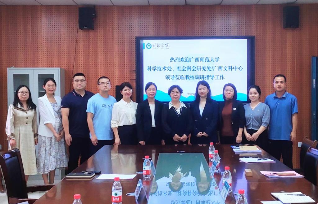 10月26日下午,广西师范大学科技处、社科处对口支援我校科研工作调研会在知善楼8312会议室成功举行。广西师范大学科技处处长沈星灿、社会科学研究处副处长邓金凤、科技处项目管理科科长唐晓虎、社会科学研究处科研科科长潘云峰出席会议,会议由桂林学院副校长何玲主持,本次会议旨在加强双方在科研领域的合作与交流,共同推动科研工作的深入发展。