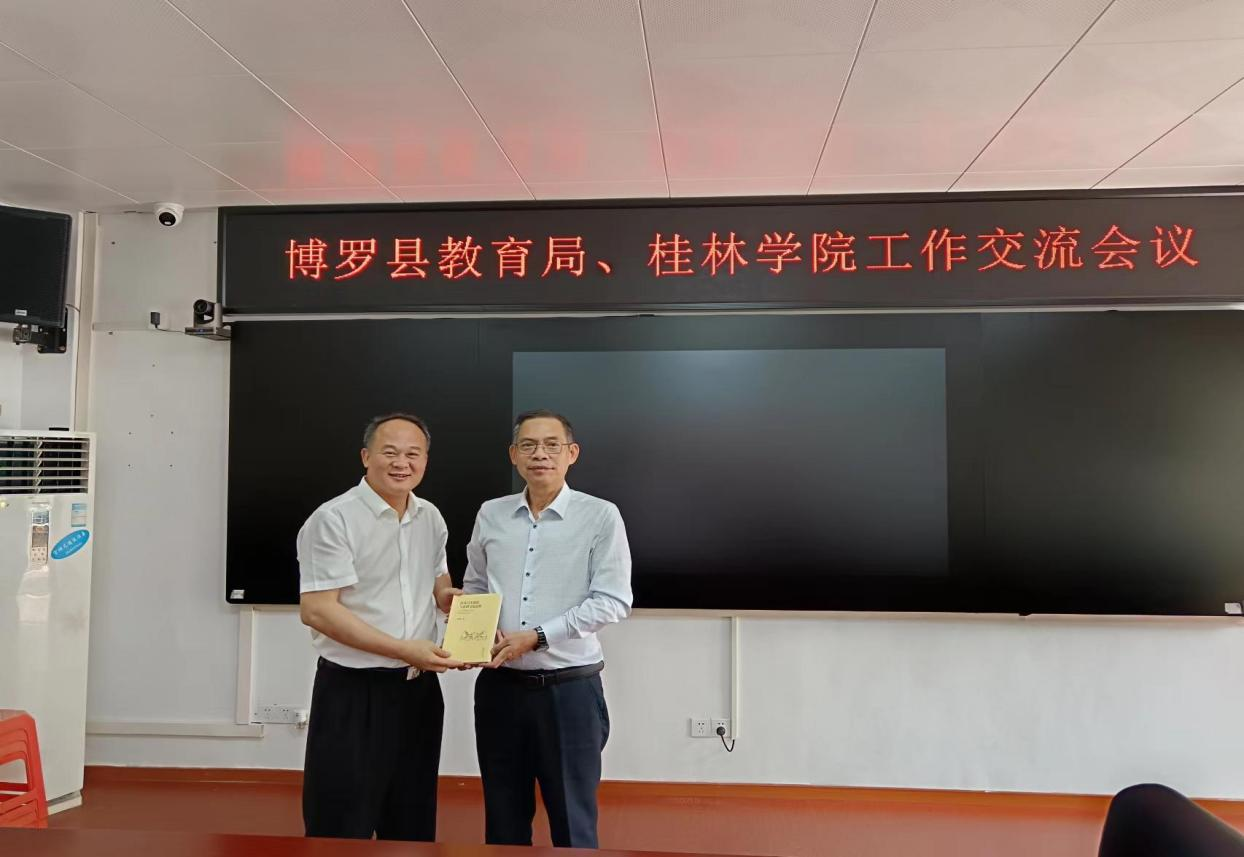 调研期间,博罗县教育局局长李云才为杨树喆一行主持召开工作交流会。该区教育局副局长张智强及相关部门(股、办)主要负责人、各实习学校校长参加了座谈。交流会上,李云才详细介绍了博罗县基础教育现状与师资需求,对我校实习生的表现和师范生培养质量给予了高度的肯定,希望进一步加强沟通交流,完善双方协同育人机制,及时发现并改进师范生培养过程中的问题,紧密合作,共同培养高质量基础教育师资。各实习学校校长对我校实习生的表现和师范生培养质量也给予高度评价,并提出了改进意见和建议。双方还就2024年教育实习安排、教师挂职锻炼、合作开展基础教育教学研究及博罗县教育局赴桂林市开展专场师资招聘会等方面进行深入交流。最后,杨树喆将新近获得“广西文艺创作铜鼓奖”的专著《民众口头创作与族群文化品性》作为礼品赠与李云才局长。