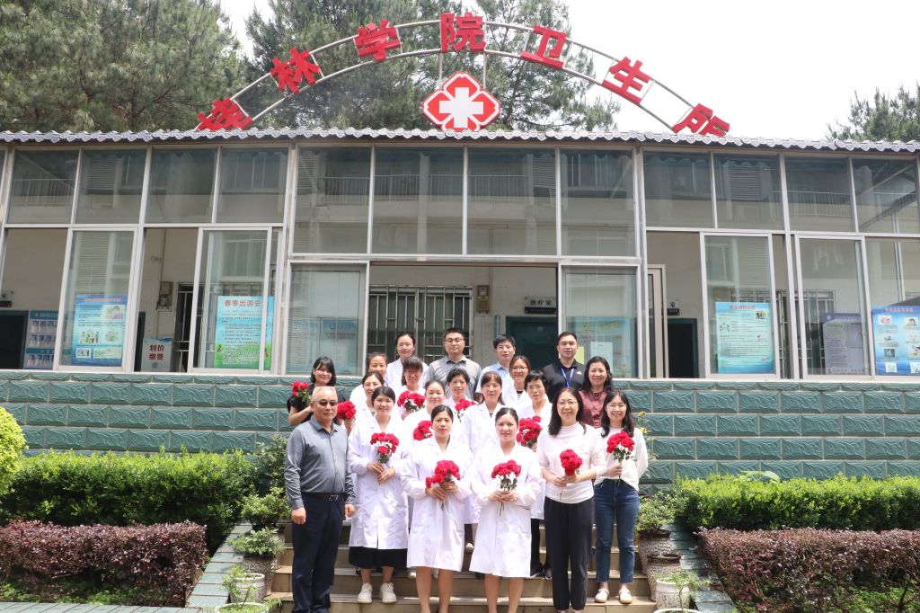 图:校党委书记唐文红(前排右一)、副校长刘文革(前排左一)与医护人员合影留念