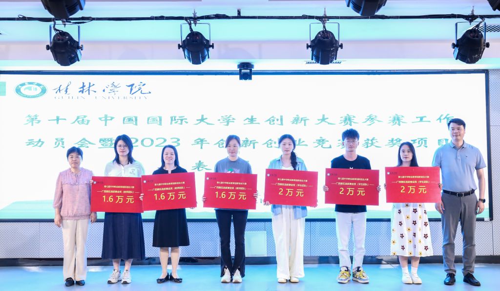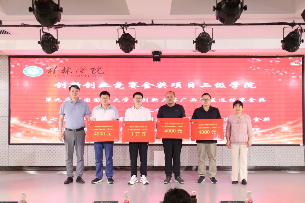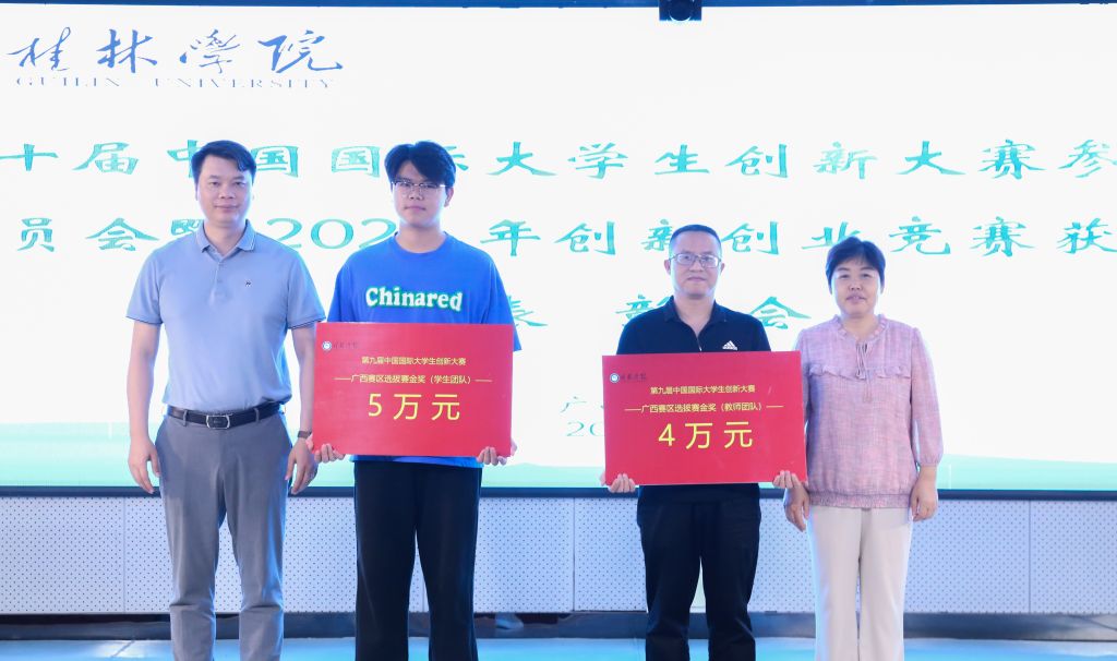 副校长何玲、蒋毅为第九届中国国际大学生创新大赛广西赛区选拔赛金奖项目师生团队颁奖