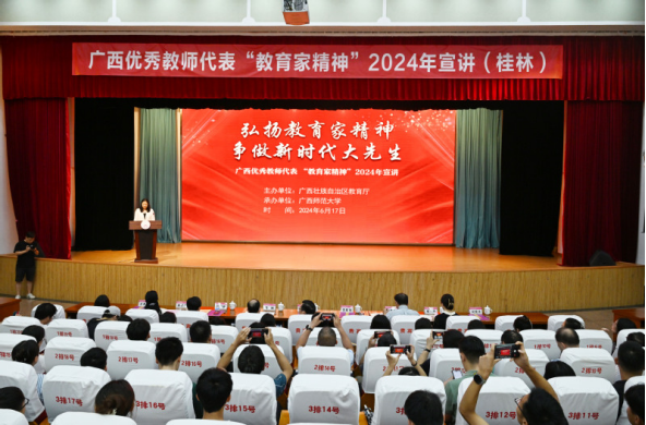报告会上,全国教书育人楷模、全国最美教师,北海市第一幼儿园园长范徽丽;全国特教园丁、全国最美教师,荔浦市特殊教育学校校长、熊碧芳;全国优秀教师,广西师范大学二级教授、博士生导师侯莉敏等3位宣讲团成员围绕“弘扬教育家精神,争做新时代大先生”主题作宣讲报告。她们以自身耕耘教育的亲身实践,讲述最质朴动人的教育故事,分享用心育人、潜心教学的感悟,深刻诠释了教育家精神和教育真谛,引导广大师生深刻认识在教育强国、科技强国、人才强国建设中肩负的光荣使命与重大责任。