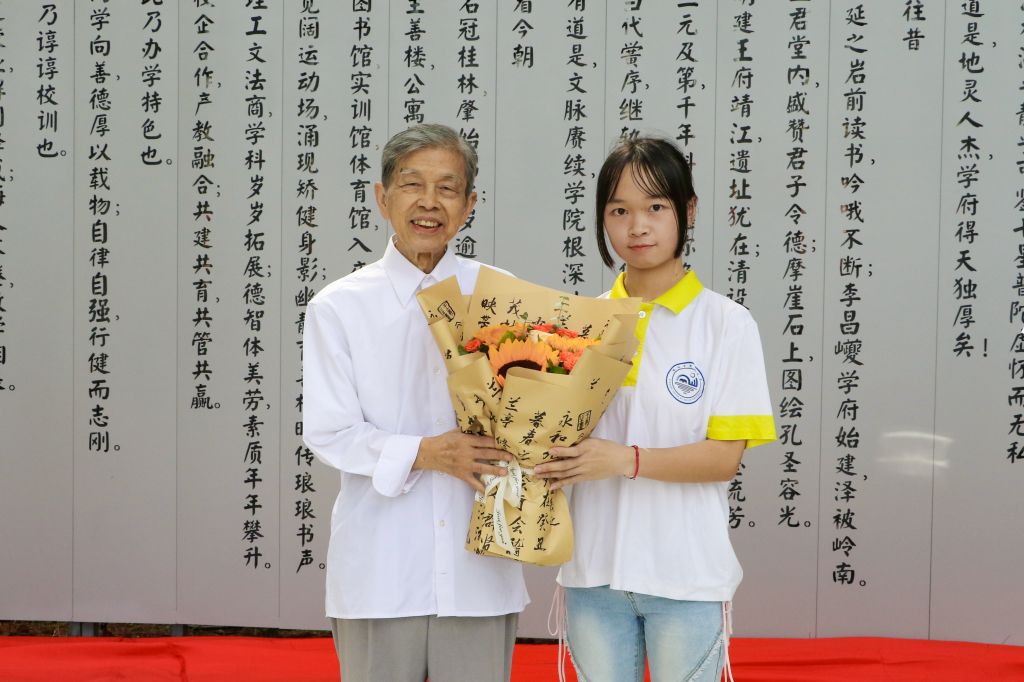 学生代表在仪式结束后为张葆全教授献上节日的鲜花和美好的祝福。
