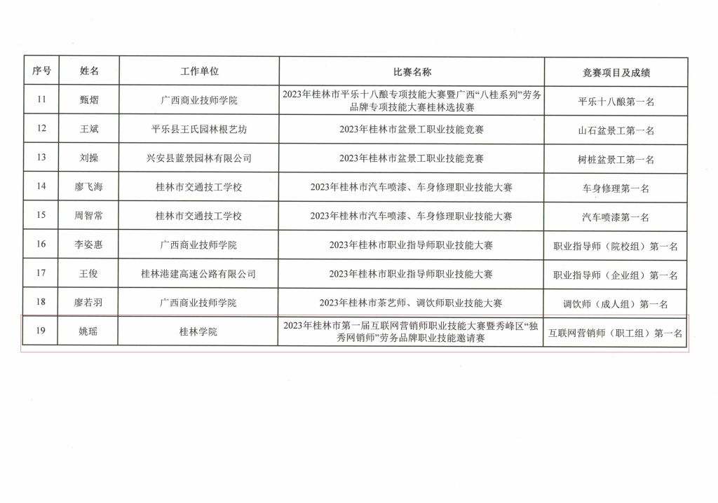 根据桂林市人力资源和社会保障局《关于授予林梅芳等19人“桂林技术能手”称号的通知》(市人社函[2024] 79号)文件精神,我校管理工程学院电子商务专业姚瑶老师,在2023年桂林市第一届互联网营销师职业技能大赛暨秀峰区“独秀网销师”劳务品牌职业技能邀请赛中获得职工组第一名并获得“桂林技术能手”称号。